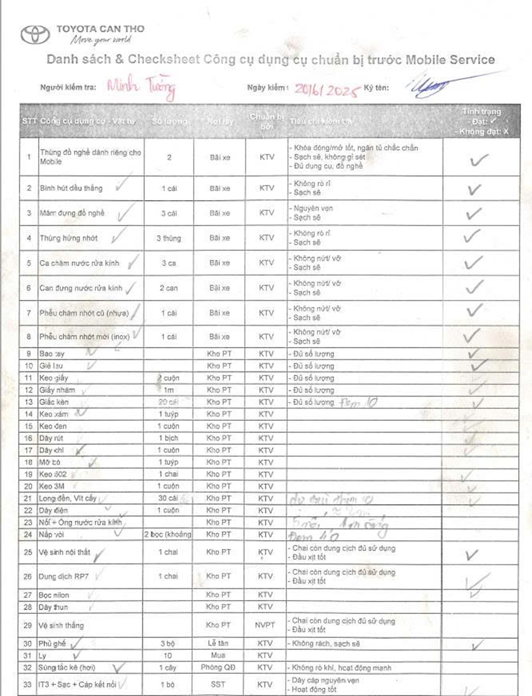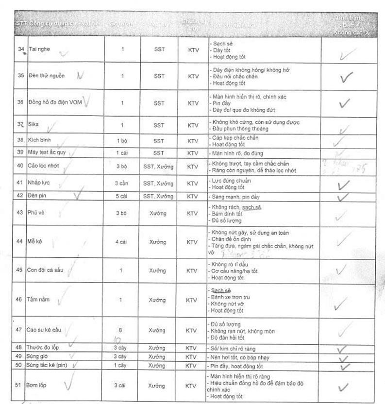 – Checksheet này đồng thời là danh mục công cụ, dụng cụ cần chuẩn bị mang theo