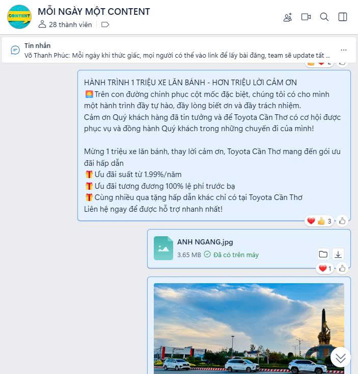 – Lập nhóm hỗ trợ “Mỗi ngày một content”. Nhóm sẽ chia sẻ những bài đăng vào chiều ngày hôm trước kèm theo hình anh/clip để NVBH chủ động lên lịch đăng bài với hình ảnh chất lượng tốt.