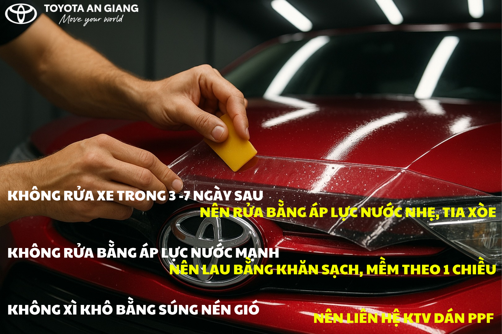 KHÔNG rửa xe sau dán PPF 3 – 7 ngày, KHÔNG xịt áp lực nước mạnh, KHÔNG xì khô bằng súng nén gió. Các việc NÊN làm như lau bằng khăn sạch mềm theo 1 chiều, rửa bằng áp lực nước nhẹ, tia xòa. Hoặc cần thiết liên hệ KTV phủ PPF để biết thêm thông tin. Tránh những hư hỏng, nhăn, hở, rách PPF, tốn vật tư, công sức và thời gian sửa chữa.